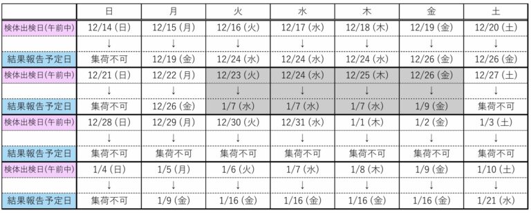 年内(12/26まで)に結果報告が可能なのは、12/22までの提出例です。検査は12/26まで受託可能ですが、12/23以降の提出例に関しては、結果報告は年明けの予定です。